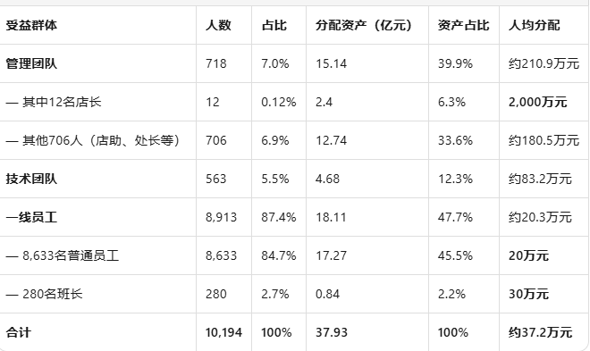 管理团队构成第一受益群体,718人占总人数的7.0%,却分得15.14亿元资产(39.9%)。这一群体内部进一步细分:12名店长处于分配金字塔顶端,每人对应2,000万元资产份额,合计2.4亿元;其余706人涵盖店助、处长等中层管理岗位。