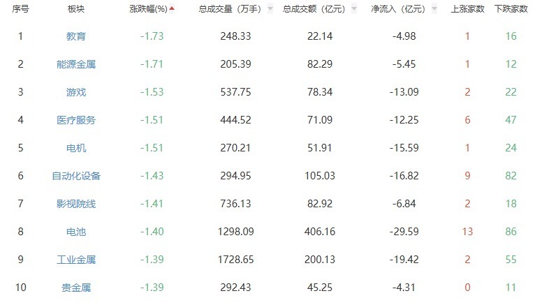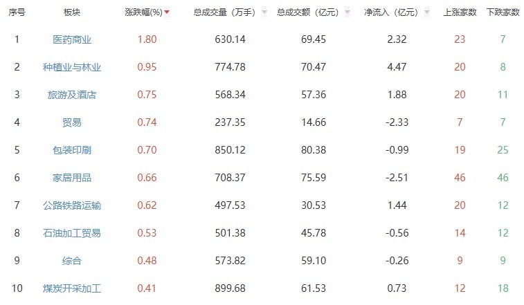 板块方面,医药商业、种植业与林业、旅游及酒店等板块涨幅居前,教育、能源金属、游戏等板块跌幅居前。