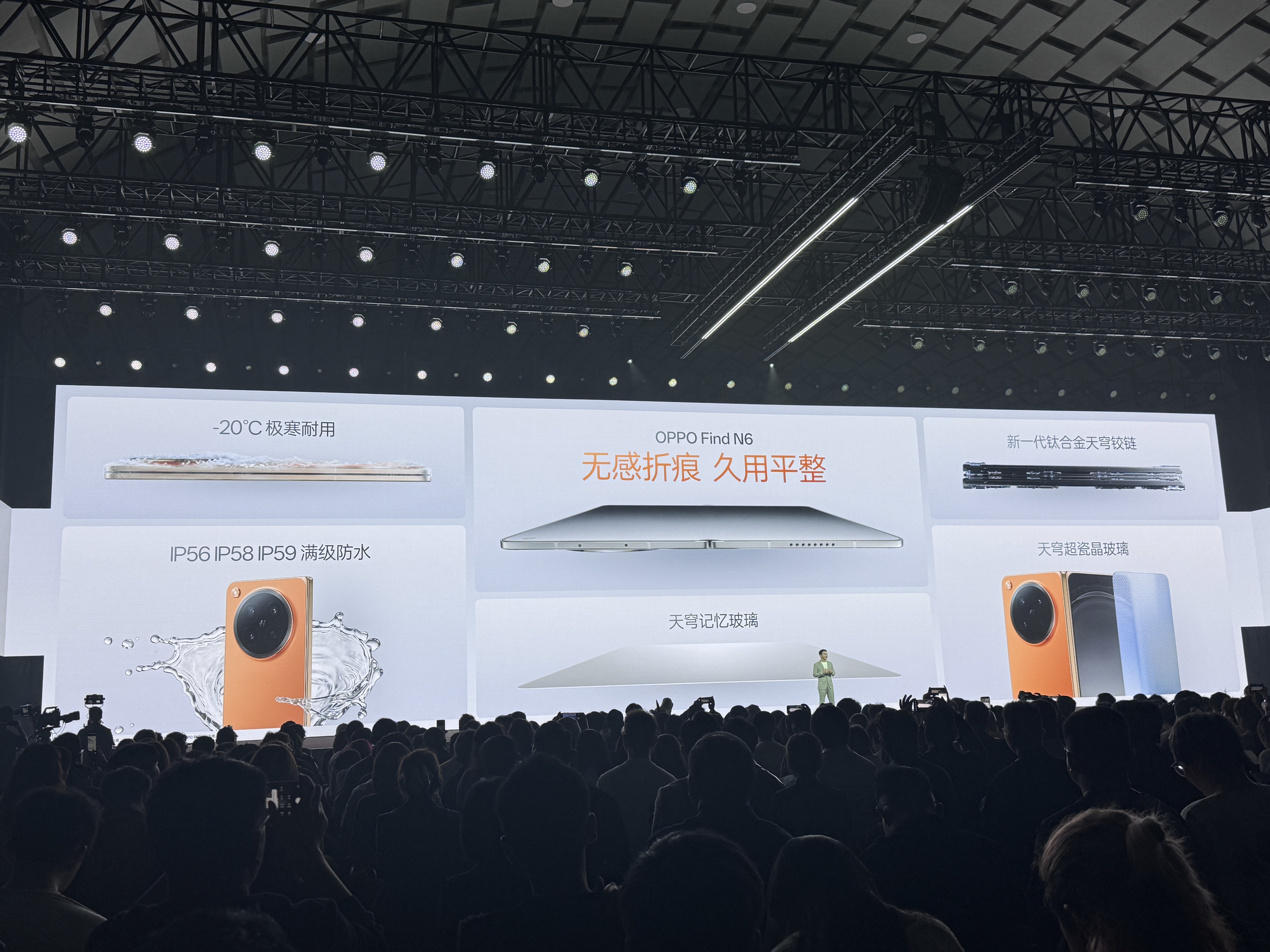 OPPO Find N6 带来了「新一代钛合金天穹铰链」与「天穹记忆玻璃」,利用芯片级高分子 3D 打印技术,实现仿生对称四轴结构“钛合金天穹铰链”,让铰链表面起伏从 0.18mm 降低到了 0.1mm,提升平整度。同时,OPPO Find N6 搭载的天穹记忆玻璃,刚性达传统柔性玻璃 3 倍以上,弯折再展开后具备 99.9% 的自修复还原度,从而实现“屏幕久用平整”。新机通过德国莱茵 TÜV 无感折痕“连续 60 万次折叠测试久用平整”认证。OPPO Find N6 支持 IP56 / IP58 / IP59 防水,可抵御强力冲水、深水浸泡与 80℃ 高温热水喷射。