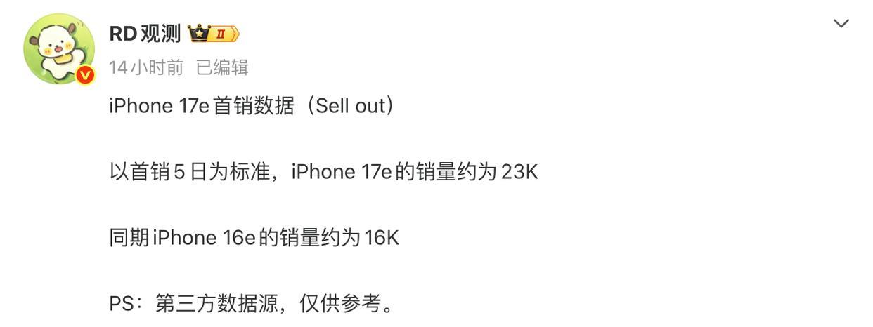 这机子是在本月初发布的,3 月 11 日正式发售,首销周对应 3.11~3.15 这五天。根据博主@RD观测 爆料,iPhone 17e 首销激活销量约 23K。