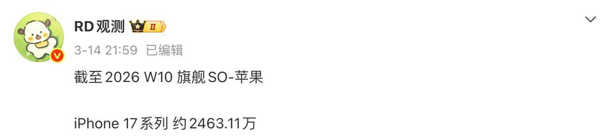 数据显示,截至今年第十周(3 月 8 日),iPhone 17 系列国内累计激活销量达到 2463.11 万台,单周新增约为 79.14 万台。#玩出数码新浪潮#